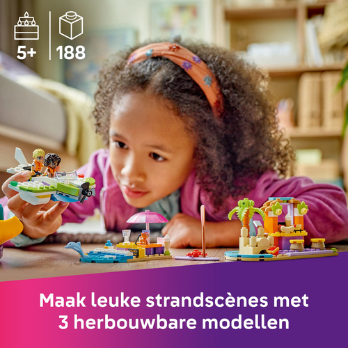 Deze fantasierijke set heeft alles wat kinderen nodig hebben om een watervliegtuig met draaiende propeller te bouwen, een relaxgedeelte met een surfplank en een strandcafé met zandkastelen, zitjes en ijsaccessoires. De modellen kunnen worden omgebouwd tot een speedboot, een terras en een pizzeria met pizzaoven. Het bouwspeelgoed bevat 2 minipoppetjes en figuren van een hond en een dolfijn voor leuke rollenspellen.